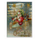 サンタ来さん!彼は夜空を通して彼の飛んでいる素晴らしい機械を操縦している。クリスマスの朝にファンシーは、航空機とその負荷の素晴らしいおもちゃのデッキの星、ストリーマーや装飾。ポストカードの復元ビクトリアンされた画像は背景霜の降りた、金ゴールドアクセントと美しい明るい色を備えている。氷柱とオーナメントに囲まれ、背景にクリスマスの村がある。