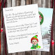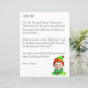 サンタさんからの手紙にパーソナライズされたお子さんの名前を付けて。かわいいヴィンテージスタイル小妖精や小人はギフトボックスを持って笑顔。バックには北極のサインがあり、ライトアップされたクリスマスライトと、サンタと北極からのスタンプが付いた雪の背景がある。