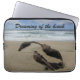 ビーチの夢?このラップトップスリーブに登場する風景の写真は、砕ける波、美しい茶色の砂、流木の一片を捉えている。地平線に明るい青い空が現れる。