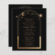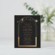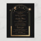 天空の黒い金ゴールドバイリンスペインのガルのキンチェニェラの招待状は、黒い背景にエレガント金ゴールドの太陽と月と星の黄金のフレームを備えている。Insideは英語でカスタムお客様のQuinceaeneraの招待状の情報。逆に招待が入っスペインのた文字・ボックスで文字を編集してパーソナライズEvco Studio www.zazzle.com/store/evcostudioによるユーザー向け設計