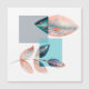 シアン、赤、オレンジの対照的な色のモダンなデザインで、葉と四角形が特徴です。