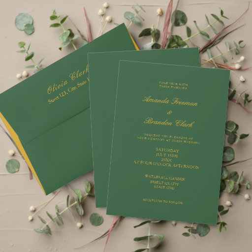 クラシックと洗練されたレイアウト金ゴールドセリフ文字を使用した深いセージの緑の背景。このデザインは時間フォーマル無く結婚、洗練されたトーンを持つお祝いに最適である。スタイルと優雅さで大きな日を発表したいカップルに最適。