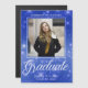 トレンディーのシニアポートレート写真の下でカスタム、あなたの高校の名前とクラスとシックな青の輝きの卒業写真の発表。2025年のエレガントクラスで卒業したシニア女子のためにこれらのカードをパーソナライズする。学カスタマイズ生の写真と卒業式の詳細