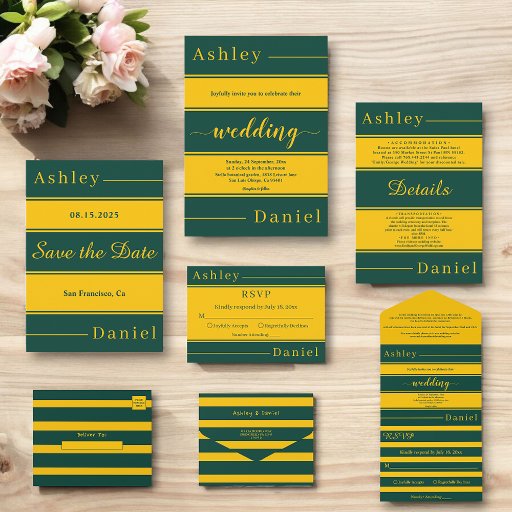 このエレガント緑と金ゴールドの結婚式招待状はモダンの結婚ための完璧なデザインでお洒落は、緑と金ゴールドの背景に黒と金ゴールドの書道を備えてストライプのいる。