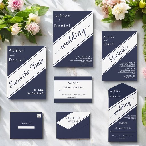 シックエレガントネイビーブルーホワイトラグジュアリーモダンズ オールインワン招待状