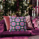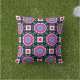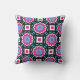 ピンク鮮やか、ブルー、ブラック、ホワイトの幾何学的な形状で構成されたシームレスパターンを特徴とする屋外ピローデザイン。