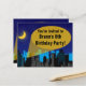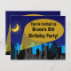 不正から人々を探し求め救済て市中にサーチライトが光る。ひょっとしたら誕生日の少年がすごいその日のヒーローに救なるのかもしれない!おもしろいの都市のスカイラインの夜のシーンで黄色い月と青の素晴らし、誕生日パーティーのテーマを作る子供へは、特にスーパーヒーローのテーマを愛する男の子。