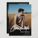 白モダン文字「卒業生」オーバーレイ、シニア写真卒業発表と黒での招待状。テンプレートの学名、学年、学年を表す線。カードの背面には2つの追加のフォト宇宙が備わっており、オープンハウス/卒業式パーティ詳細の文字ラインを備えている。