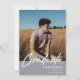 白モダン文字「卒業生」のオーバーレイ、シニア写真卒業発表とグレーでの招待。テンプレートの学名、学年、学年を表す線。カードの背面には2つの追加のフォト宇宙が備わっており、オープンハウス/卒業式パーティ詳細の文字ラインを備えている。
