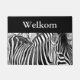 シマウマの近い上りのプリント-文字"Welkom" -それはアフリカーンスの言語にあります。 アルマのかたまりによる元の芸術との白黒のファンキーな玄関マット。 レトロのスタイル項目が認められる家で素晴らしい。