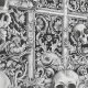 ゴシッ表現ク様式の大聖堂の飾シャルネルの家にインスパイアよって、この白黒のデザインでハロウィーンのゴシックの美観やための。白いスカルはつる植物で彫られた石のニッチから突き出る。