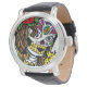 砂糖かわいらしスカルの女の子は彼女の長い茶色の髪に赤い花を持つ。おもしろいの色とパターン