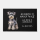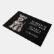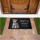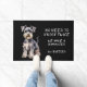 "2回ノックする必要はない、我々はシュナウザー"このドアマットを宣言おもしろいしている。文字は右側が白く、可愛らしいグレーのシュナウザー・テリア犬の姿が写ってい離れる。すべて黒い背景に置かれる。
