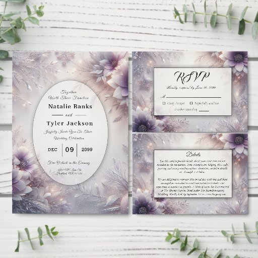 シルバーとソフトアメジスト冬の開花結婚ズ 出欠カード (この独立クリエイターのコレクションをカスタマイズ。)シルバーとソフトアメジスト冬の開花結婚ズ 出欠カード (正面)シルバーとソフトアメジスト冬の開花結婚ズ 出欠カード (裏面)
