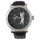 ゴルフのファンに最適な魅力的な時計が登場!中央にピカピカのシルエットをフルスイングでプロゴルファーが立ち並び、シルバーモノグラムを縦横に合わせ走たトリプルモノグラムを離れ横向きに持ちている。銀色の数字も入っており、すべてが黒いドラマチックな背景に置かれている。