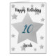 正面に星パーソナライズされたが振りかけられたボーイ·バースデーカード。 星の下に年齢と名前を入れて、銀色の星を簡単に個人設定できます。内部カードの「子読どもへのハッピーバースデー最高の!」というメッセージ 簡単に欲しいと思うパーソナライズされたこもしともある。この少年のバパーソナライズされたースデーカード「読ハッピーバースデー2018」の裏。