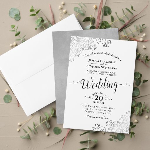 このエレガントな結婚式の招シンプル待は、シック、クラシックと美しい。白い背景にフェイクグレーのスクリプ縁どトレタリングを持つホイルフローラを上下にファンシー配置した特徴がある。言葉はフォーマルそしてファンシー、あなたの人生の最も特別な日の一部であるためにゲストを招待状することができる。