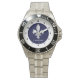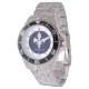 ダークブルーの背景に銀のフルーアデリスを配し、白の周囲に黒い数字を配し、時間を示すクラシックステンレス時計。名前を付けてパーソナライズしカスタマイズて背景の色を選違う択する。ストラッ違うプカラーまたはウォッチ違うスタイルを選択