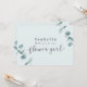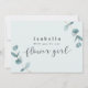 シンプル ミニマル ユーカリ フレーム スクリプト ウェディング フラワーガール ブライダルパーティー プロポーズ カード。春または夏のガーデンやアウトドアをテーマにしたウェディングステーショナリーに最適です。 ティールアクアグリーン、パステルミント、ダスティーブルーグレー、シンプルなクラシックホワイトの、優しい繊細なミュートカラーパレット。 エレガントなスクリプトカリグラフィーフォントが、フラワーガールの文字を特集しています。 このデザインは、ファームハウス、カントリー、またはガーデンウェディングに最適です。 ゲストに送るシンプルなユーカリウェディングインフォメーションカード。 DIYで手頃な価格のウェディングステーショナリーのための、簡単にカスタマイズできるテンプレート。