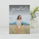 白いクラシックな「卒業」スクリプトが、あなたの卒業生の単一の縦向きの写真を際立たせます。この卒業のお知らせは、大学または高校の卒業生のどちらにも適しており、あなたの写真を輝かせるのに十分シンプルです。タイムレスなデザインで、ストライプの裏地(デフォルトはクラシックなチャコールグレー)があり、カスタマイズ可能な色を特徴としています。写真の上部に言葉が表示されますが、写真の下部に言葉を表示するデザインも利用可能です。