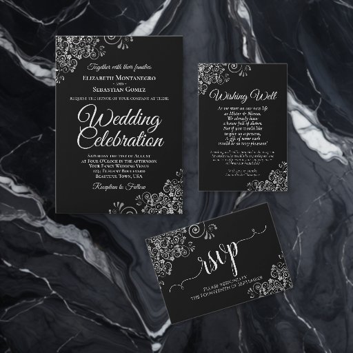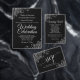このシーティングチャートで結婚式の披露宴を美しく。銀箔のシンプルフローラでエレガント、黒い背景に薄い灰色の文字を持つデザインがフェイクありる。このグラフはテーブルの割り当てを表示し、ゲストが適切なテーブルを見つける簡単時間を得られるようにします。