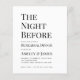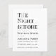ミニマシンプルリストの黒と白のリハーサルのディナーの招待。白い背景に黒い文字がある。タイトルの"The Night Before"、大事な行事の"リハーサルのディナー"と名前は大きなキャップです、残りは小さなキャップで。文字離れが揃った。