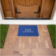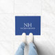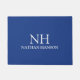 モダンフォントにモノグラムを入れシンプルてミニマル、名前と共に青と白のデザインを使ったビジはっきりしたネスドアマット。