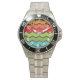 この時計は1970年代のレトロなデザインで、茶色のフィールドに黄色、オレンジ、赤、緑、青の水平ジグザグ線を持つ。