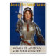 ジャンヌ・ダルクを特集したWWIのポスターは、アメリカの女性たちを戦争への支援に駆り立てるように設計された強力なプロパガンダの一部であった。イギリスに対して自国を勝利に導いた伝説的なヒロインであるジョアンフランスの・オブ・アークのイメージはインスパイア、愛国心と義務感により戦略的に選ばれた。このポスターのメッセージ「アメリカの女救人、あなたの国買- – 戦争貯蓄切手」は、女性の国のプライド感覚と自国からの戦争努力に貢献する能力に直接訴えた。ジョアン・オブ・アークのライフストーリーに対するポスターのつながりは、その影響をさらに増幅させた。フランスの田舎の若い農民の少女ジョアン・アークは、百年戦争で彼女を率いて軍を率いるよう呼び出す神の幻を受け取ったと主張しフランスのた。イニシャル懐疑主義にもかかわらず、彼女の揺るぎない信念と軍隊の腕前は、英語に対する大きな勝利をもたらした。彼女の話はアメリカ人、特に女性に響き、勇気と決意を具現化し、より高い目的への信念を具現化した。このポスターは、戦争記念切手の購入をジャンヌ・ダルクの英雄的な行動と一致させることで、女性が自国の勝利を確保する上で重要な役割を果たすことができると示唆し遊た。・ポスターの成功は様々な要因に起因する可能性がある。まず、文学や芸術、歴史の記述を通じて広く普及してきたジョアン・オブ・アークへの賞賛の声が広まった。第二に、強い意志を持つ女性の力強いイメージを効果的に活用し、国を勝利に導く。第三に、女性が前線で活躍できなくても、戦争に貢献するもしための具体的な方法を提示した。戦争貯金切手を購入することにより、女性は大きな感じ原因に力を与え、接続することができる。WWIジャンヌ・ダルクのポスターは、プロパガンダの力と戦時中の女性の役割を示すアメリカの歴史の重要な部分であり続けている。それは第一次世界大戦の間に数え切れないほどの個人が犠牲を払った時の思い出であり、勇気と愛国心の象徴としてジョアン・オブ・アークの永続的な遺産を思い出させる役割を果たしている。 – 本著作物は、原産国その他の国・地域の公有地に属し、著作権の存続期間に80年以下の期間を加えた地域に属する。 – この作品は1929年1月1日までに発行統一された(または米国著作権局に登録)されたため、州内のパブリックドメインにある。