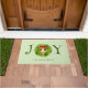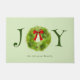 赤素朴い弓で緑のテーマの水色イラストレーションを特徴とする緑のリースのdoormat。文字はフェスティバルフォントで「JOY」と言う。下にファミリ名を追加する