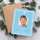 白い枠と白いクロスを持つ空の青飾い背景をパーソナライズし、写真名と詳細を追加する。白文字。アーチ形のフォトフレーム。1枚= 1枚の招待状を印刷したエッジからエッジ
