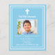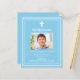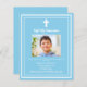 白い枠と白いクロスを持つ空の青飾い背景をパーソナライズし、写真名と詳細を追加する。白文字。1枚= 1枚の招待状を印刷したエッジからエッジ