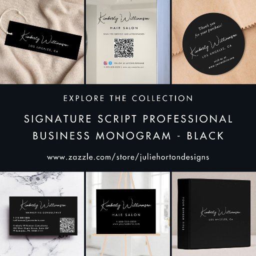 Venmo、Paypal、ZelleのQRコードを使用してビジネス用のシックな黒いペデスタルテーブルトップのサインをモバイル決済をスキャンし、あなたの名前やブランドを白い署名スクリプトに表示さスタイリッシュれる。QRコードをアップロードし、情報をクリーンな白連絡色のレタリングに追加する。