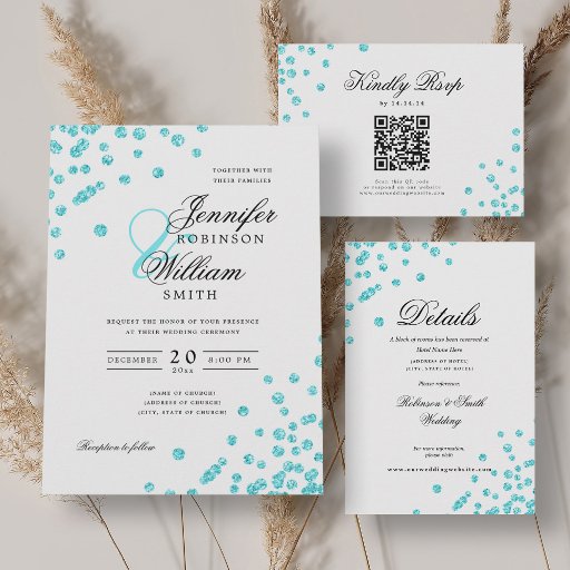 スクリプエレガントトのターコイズ紙吹雪QR RSVP 招待状