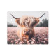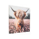 赤面ピンクの花の畑に立つ可愛いハイランド牛をモチーフにしたアートプリント。