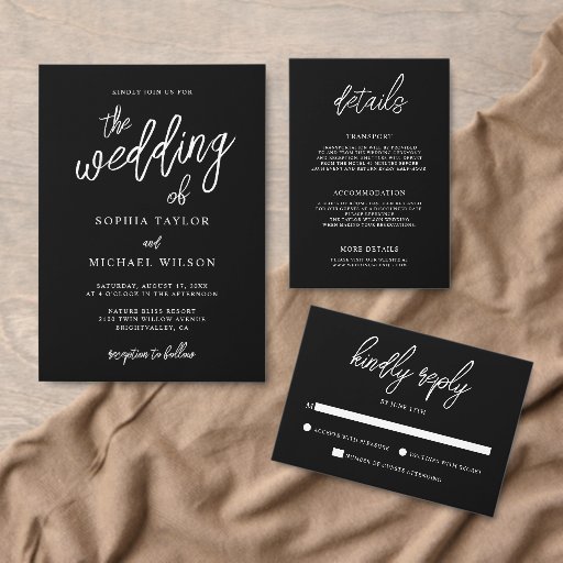 この結婚詳細カードは白黒のモダンデザインと手書き書しゃれているのtouchを提供している。このデザインは、交通と宿泊施設のセクション澄んを備え、簡単間のレイアウトを読提供する。ウェブサイトのURLは追加情報にも含まれており、これは完全かつ機能的にあなたの結婚式招待状を補完する。