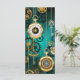 ジュエリー、金ゴールドチェーン付きの金ゴールドウォッチ、緑のテクスチャの背景の鍵。ステームパンクスタイル。