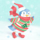 冬のフェスティバルペンギンが氷の上を楽しげに滑り降り、小さな青い空に繊細な雪の結晶秋!オリジナルイラストレーションby artist, Noel Snow.