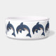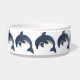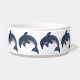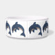 このペットフードボウルは、きれいな輝きのある濃い青いイルカが白い腹でジャンピングポジションをとっており、黒と白の渦巻き目をしている