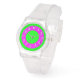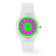 緑とマゼンタのファッショナブルなアナログ時計、黒い影と白い数字、スポーティなピンクのストラップ。白いストラップも選べる。この時計は30メートルに耐水性で、ワードローブのアクセサリースタイリッシュやタフだが上品な作業時計、さらには時保間である。