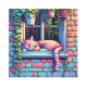 植物やレンガの壁に囲まれた窓枠に眠い猫つるを描いた愛アート。植物や猫好きのキュートな芸術。