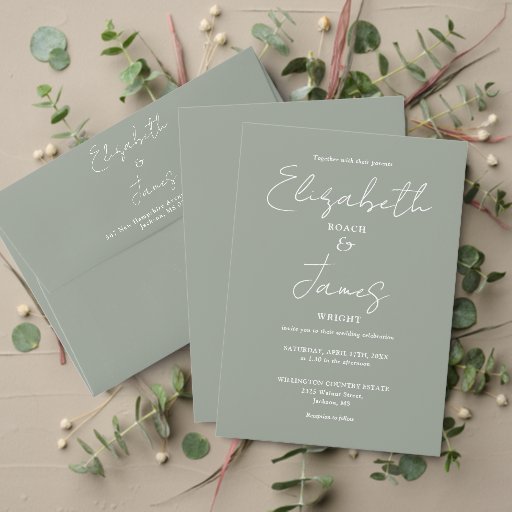 Simple Sage Green Script Wedding Invitation Suiteデザイン: Pure Piglet Designs