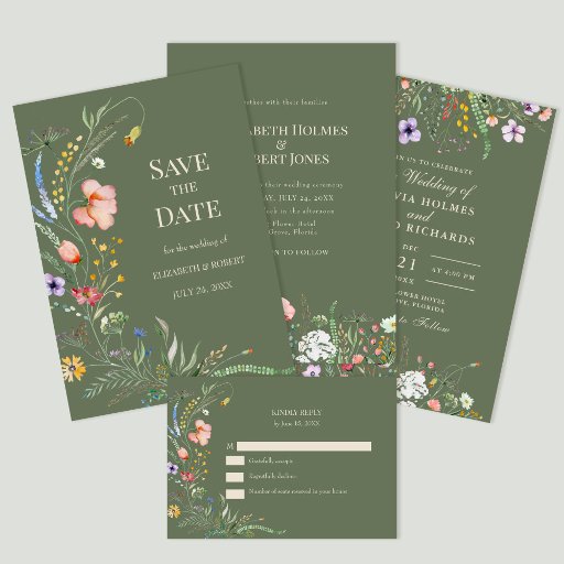 セージ緑の野結婚花の詳細カード 招待状