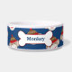 青い背景とソックサルが多いカスタマイズ可能なソックモンペットフードボウル!中央の犬の骨には「Monkey」という名前が付いているが、任意の名前に変更できる。