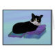タキシードの写実的なイラストレーション装飾用クッションでうたた寝している猫。