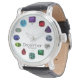 タンザナイト、12月の誕生石の宝石の腕時計1時 – >1月 – ガーネット(クッションカット) 2時 – >2月 – アメジスト(兆カット) 3時 – >3月 – アクアマリン(楕円カット) 4時 – >4月 – ダイヤモンド(ハートシェイプ) 5時 – >5月 – エメラルド(エメラルドカット) 6時 – >6月 – アレキサンドライト(クッションカット)7時 – >7月 – ルビー(Pear cut) 8時 – >威厳がある – ペリドット(cut) 9時 – >9月 – サファイア(oval cut) 10時 – >10月 – オパール(Oval Cabochon cut) 11時 – >11月 – トパーズ(Round cut) 12時 – >12月 – タンザナイト(エメラルド)宝石の写真で実在す。