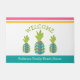 「ようこそ」。熱帯島のホスピタリティのビットをビーチの家に持って来て、このシックでモダンdoormat。3,グラフィックモダン,ターコイズティール(緑がかった色)ブルー,グリーン,ピンクとオレンジのパイナップル,ピンクとオレンジのパインストライプズ,春グリーン手書きタイポグラフィ,ターコイズブルーバンド上のあなたの家族の名前とメッセージと一緒に,白い背景をオーバーレイ。フロントドアにおもしろい感じフェスティバルを追加!テンプレートを使用する簡単で情報を入力するだけで、このウェルカムフォーマットを簡単にカスタマイズできる。質問や要望があれば私に連絡して下さい。