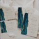 このエレガントなモダンな結婚式招待状の左端には、疑似ゴールドグリッターでトリミングされたターコイズの水彩アゲートの境界があります。 カスタマイズ可能なテキストは、白い背景にチャコールグレーで手書き、銅版、イタリックフォントを組み合わせています。 裏面は、QRコードが付いた無地の白い背景に結婚式の詳細を記載するスペースがあり、ゲストはウェブサイトを訪れて返信するためにQRコードをスキャンできます。これにより、別々の返信カードの印刷と郵送の費用を節約できます。