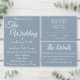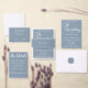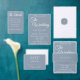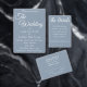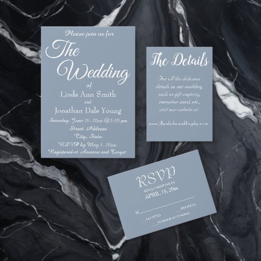 トレンディーシンプル、ほこりっぽい青い色の背景に加え、将来の新郎新婦の名前とイベントの日付、時間、場所、およびレジストリが白い様式化されたスクリプトで印刷された結婚式招待状スタイル。情報を独自の結婚式招待状に置き換えることによって、情報をパーソナライズする。招待紙スタイルと数量を選択する。私たちのダスティブルースタイルのコレクションシンプルと調整す結婚るように設計。