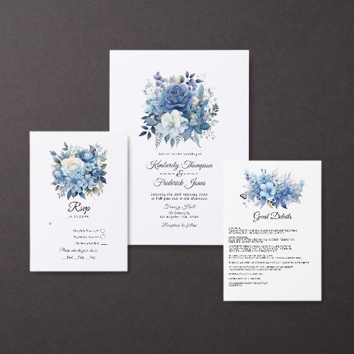 埃っぽい青いフローラ結婚式招待状とエレガントタイポグラフィはイベント仕様にカスタマイズ可能。